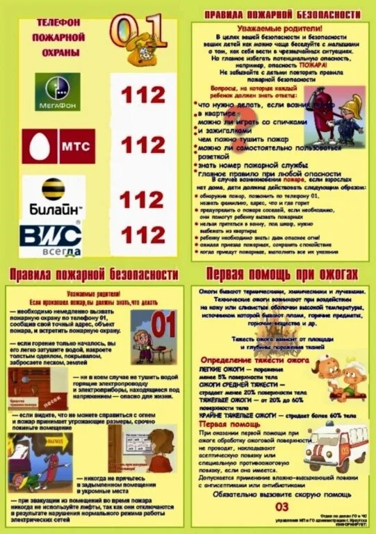 1. При обнаружении признаков пожара сообщите об этом взрослым, позвоните по телефону 01, 101, 112 и назовите адрес, где вы находитесь.